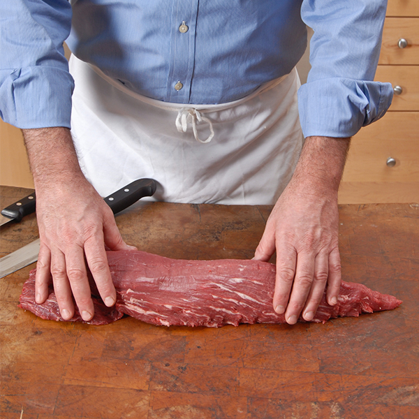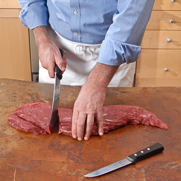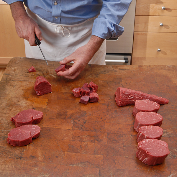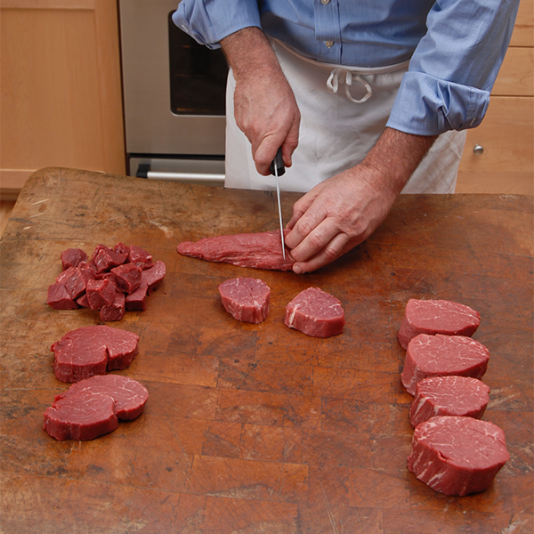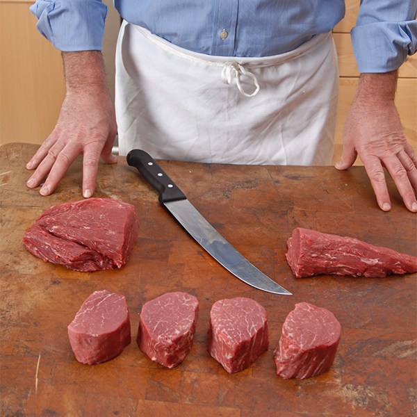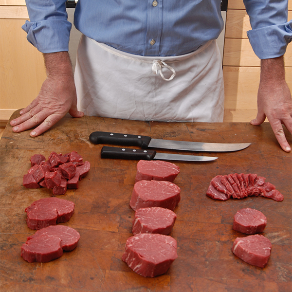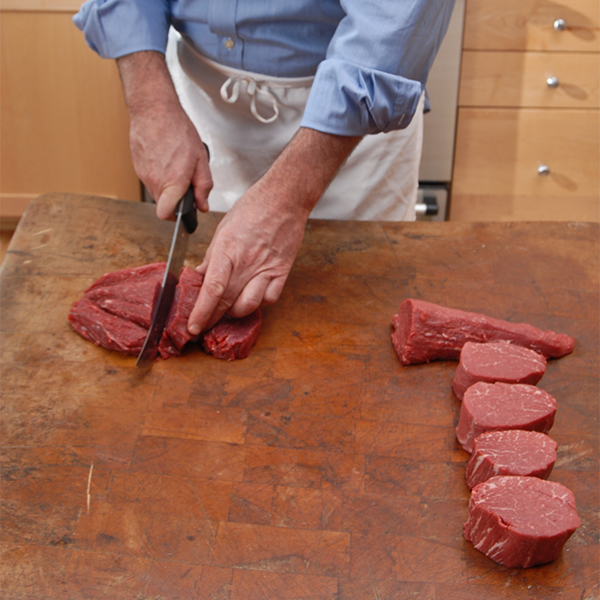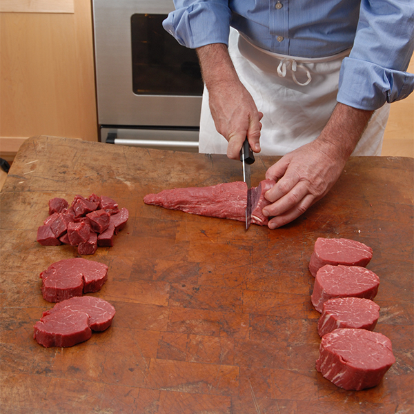 Similar to the head, the tail can also be cut into steaks, cubes, strips, or a combination. Here we’re showing how to cut tournedos steaks from the tail.