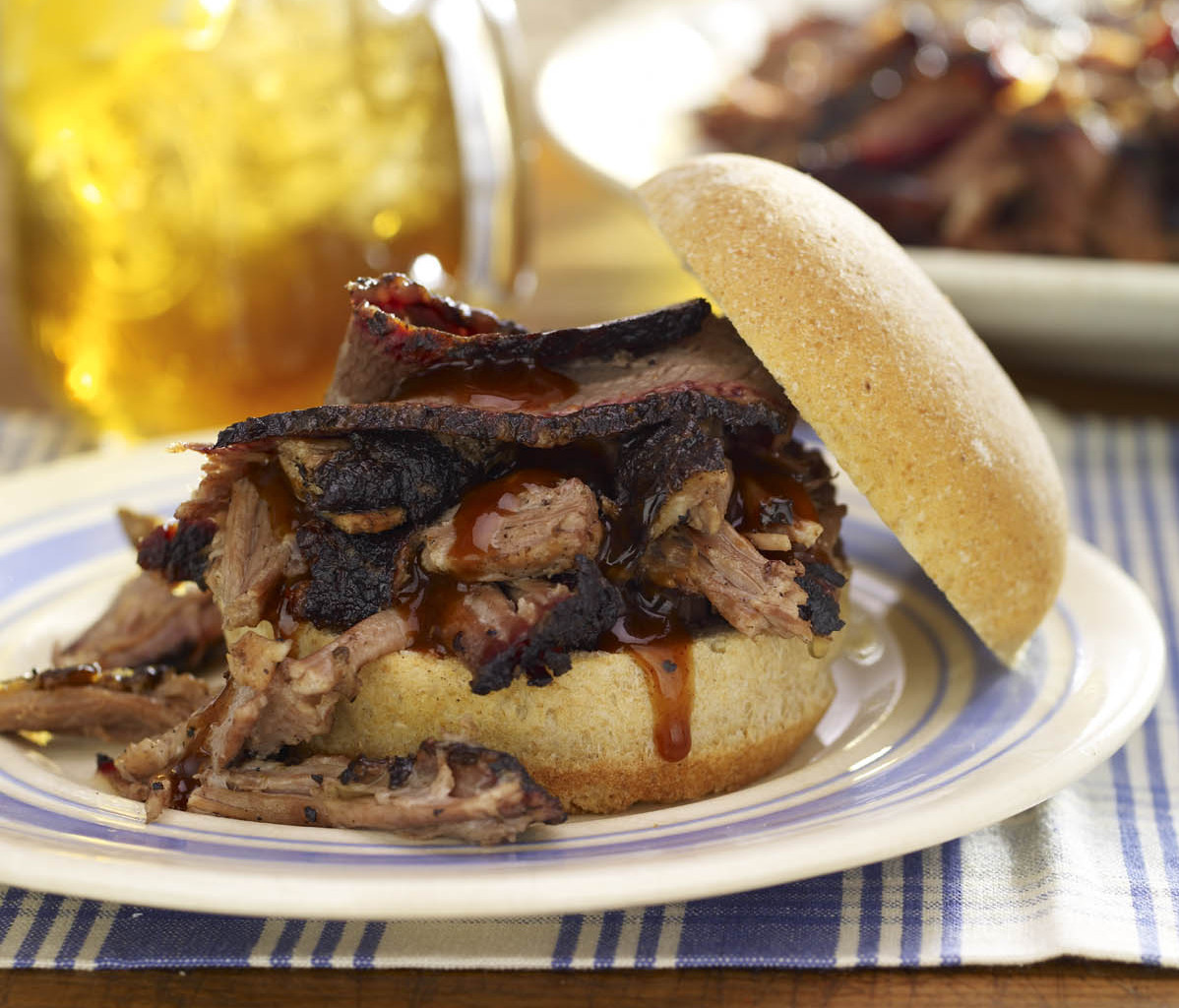 We like to serve our BBQ Prime Beef Brisket with a side of fresh, crunchy slaw. We mound the brisket up on a bun then splash it with this mopping—the same sauce it’s bathed in while smoking—to add the finishing touch.